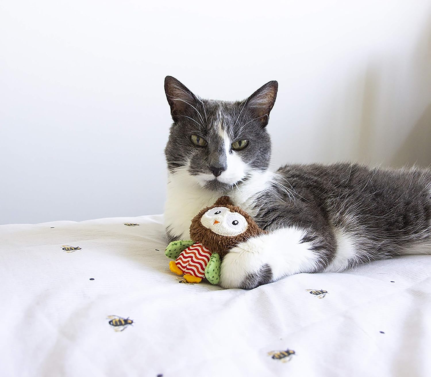 Cute little owl toy. The kittens carry this around now and jump on it. It has a crinkly sound which they seem to like. They also roll on it. I even saw Mum cat carrying it so it�s a good cat toy.