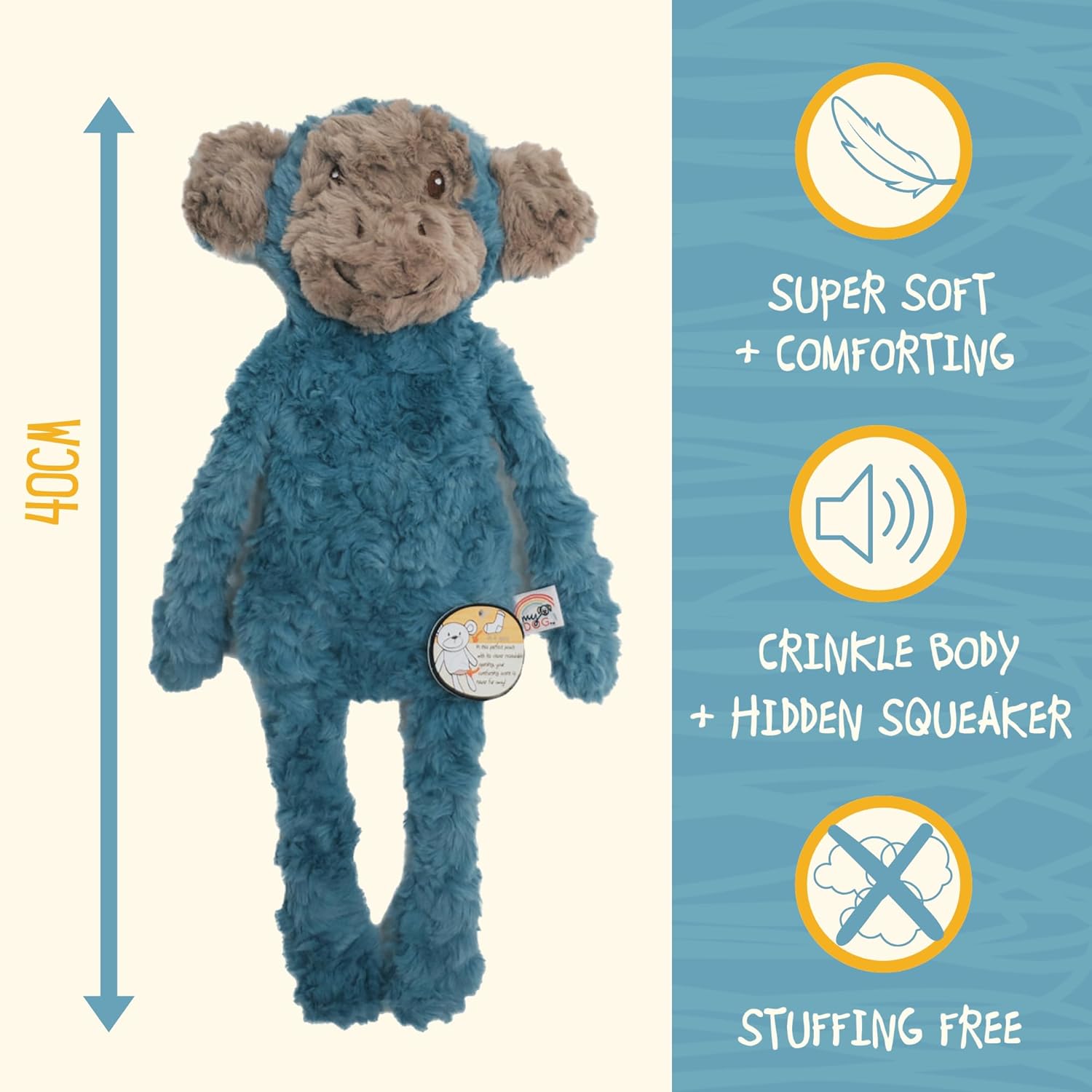 Rosewood My Dog Monkey Stuffingless Dog Toy - stuff the tummy with something that carries scent to comfort your dog while you're away or at work. Crinkles and squeaks for added excitement. Match the toy to your dogs personality & character. Monkey characteristics - problem solver, independent, cheeky, curious, clever.