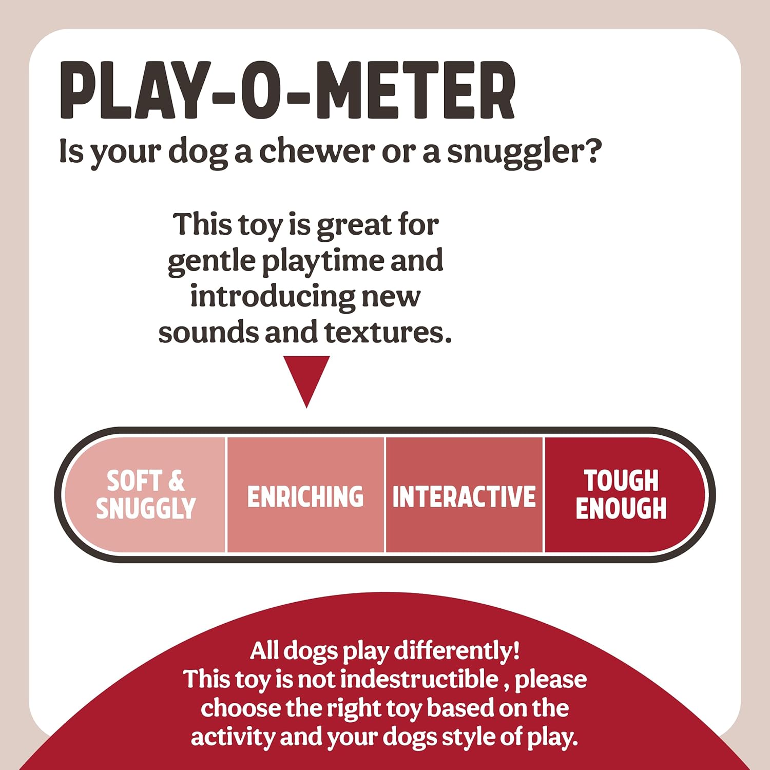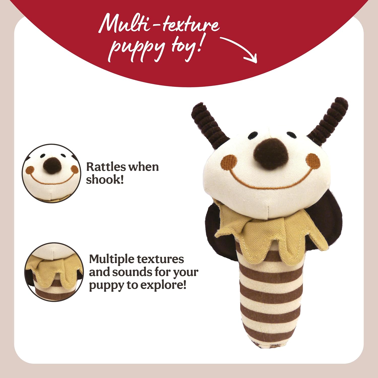 This is a good puppy toy. My pup loves noisy toys. This is described as a rattle, but it is doesn't rattle! It has a single sleigh bell inside that makes a subtle jingle, not enough to excite my puppy. However, it's strong & well made with lots of bits to chew, when I can get him interested. It just doesn't grab his attention as much as other toys. Great for the price though.