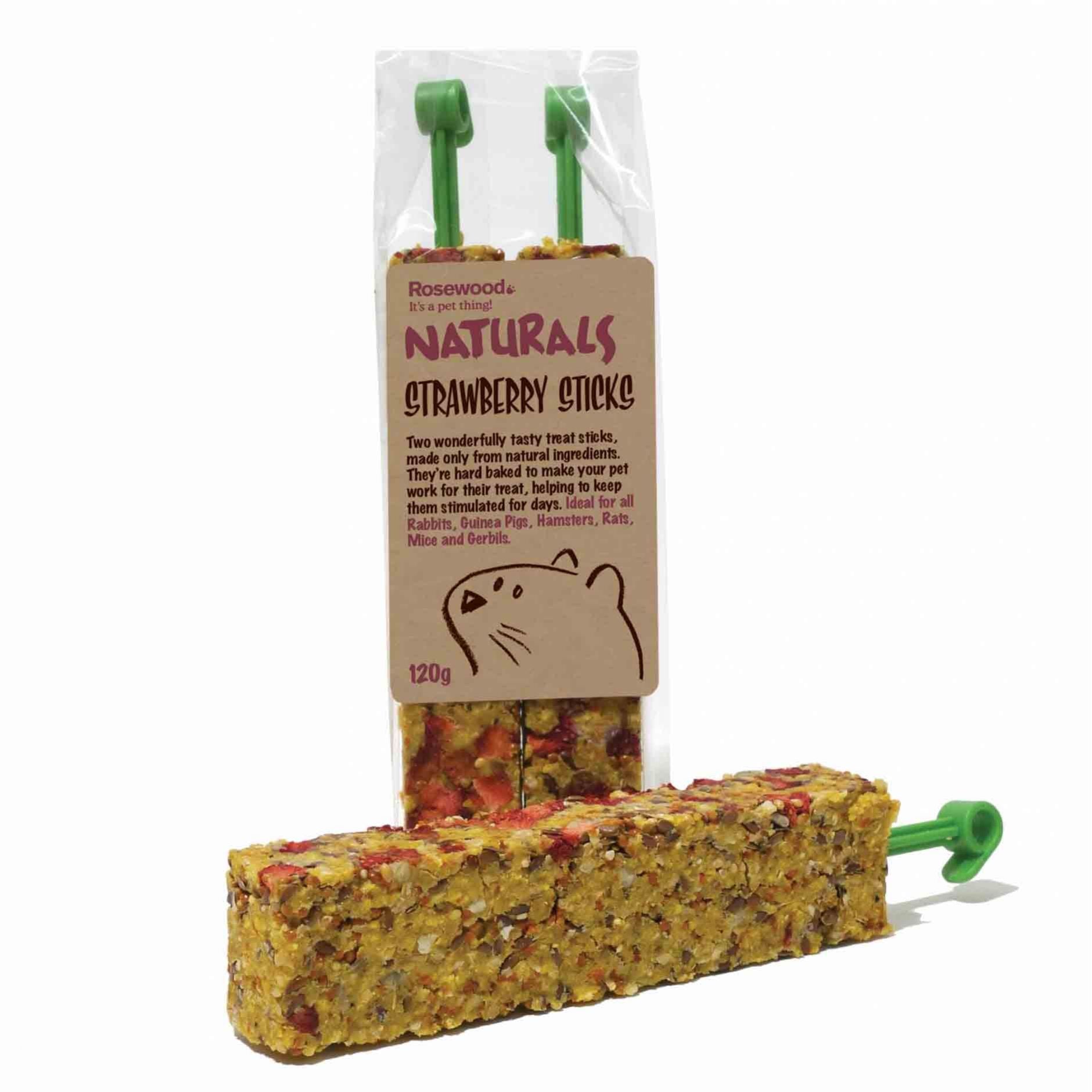 Rosewood Naturals Strawberry Sticks 120g are tasty, healthy small animal treats made from natural ingredients. Created as a great tasting way to provide your animal with an appealing and stimulating snack that is also full of healthy sustenance, these hard baked treat sticks will make your small furry work for their snack, keeping them entertained for hours.