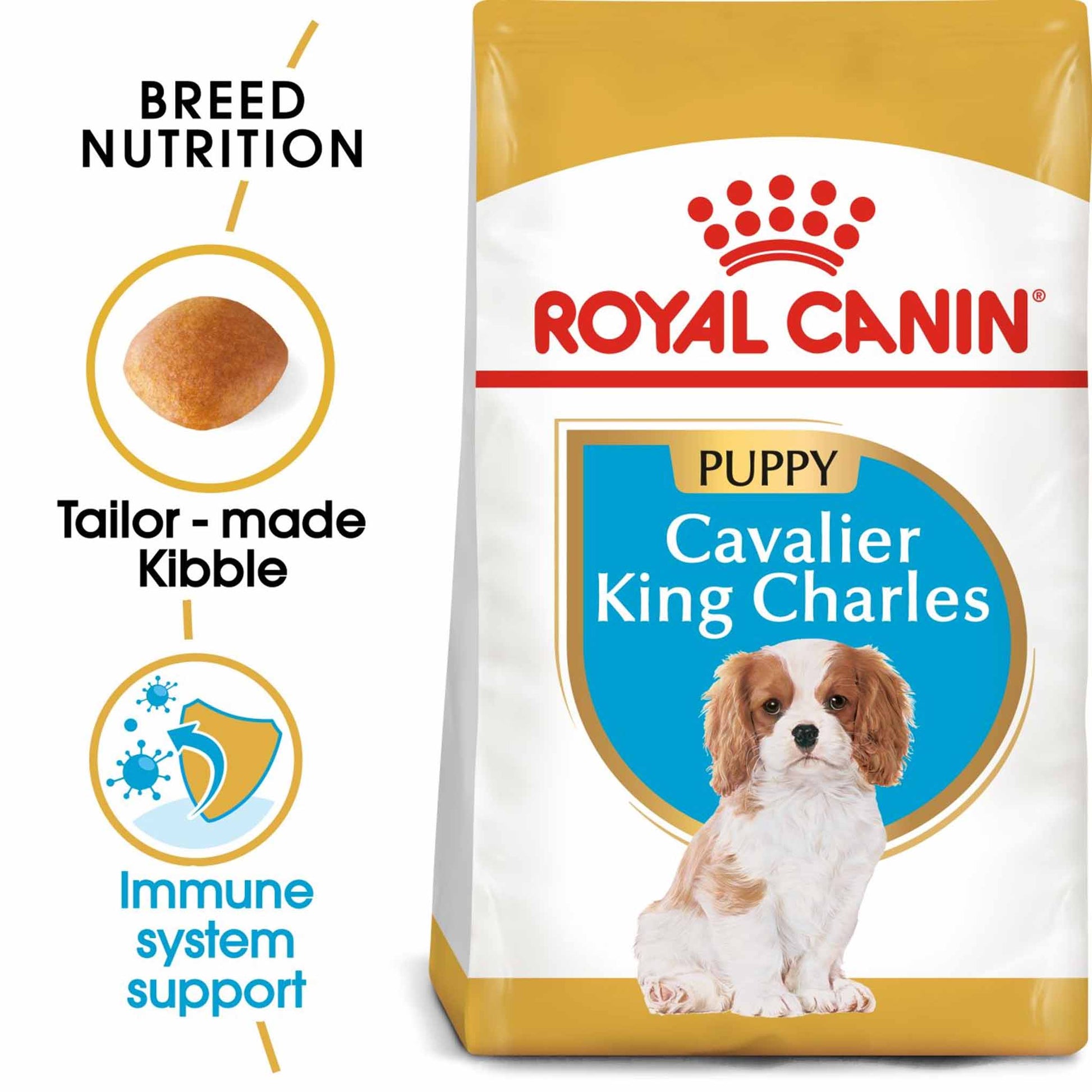 Growth is an essential stage in your King Charles Cavalier puppy's life. It's the time of physical changes, new discoveries and new encounters. During this key period, your puppy's immune system develops gradually. That's why it's important to select a food that provides your dog with nutrients that support optimal health. Suitable for puppies up to 10 months old, ROYAL CANIN Cavalier King Charles Puppy is specially formulated with all the nutritional needs of your growing puppy in mind.