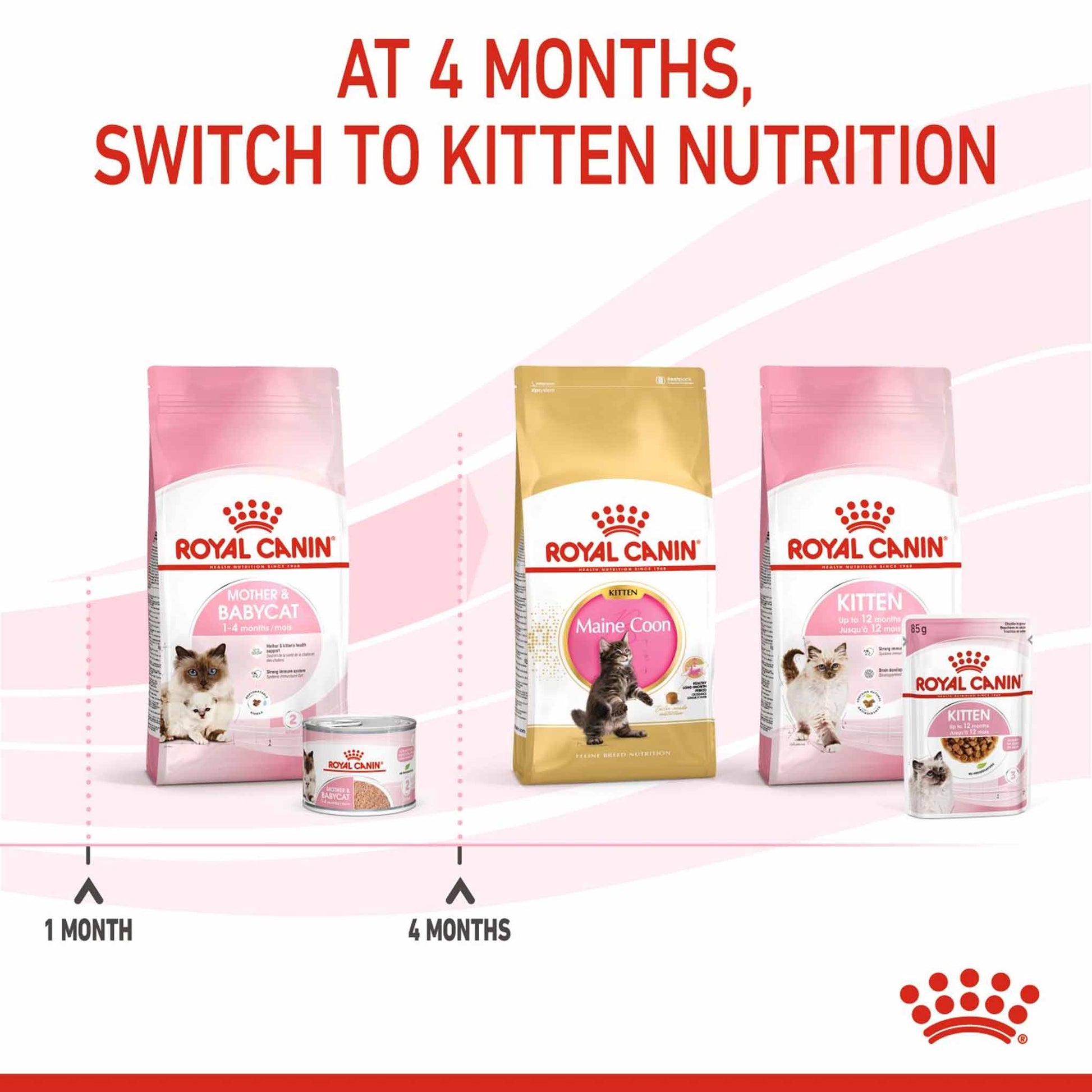 ROYAL CANIN Mother Babycat Ultra Soft Mousse is not only easy for weaning kittens to eat, but it helps provide the lactating mother with the moisture she needs for milk production. Did you know that a kitten's nutritional needs change as they grow? In the short span of 16 weeks, they will need a diet that's specially adapted to meet their nutritional needs during the next growth phase. At this stage, you can transition them onto ROYAL CANIN diets for kittens. These are available as dry kibble diets or as wet chunks in loaf, gravy or jelly.