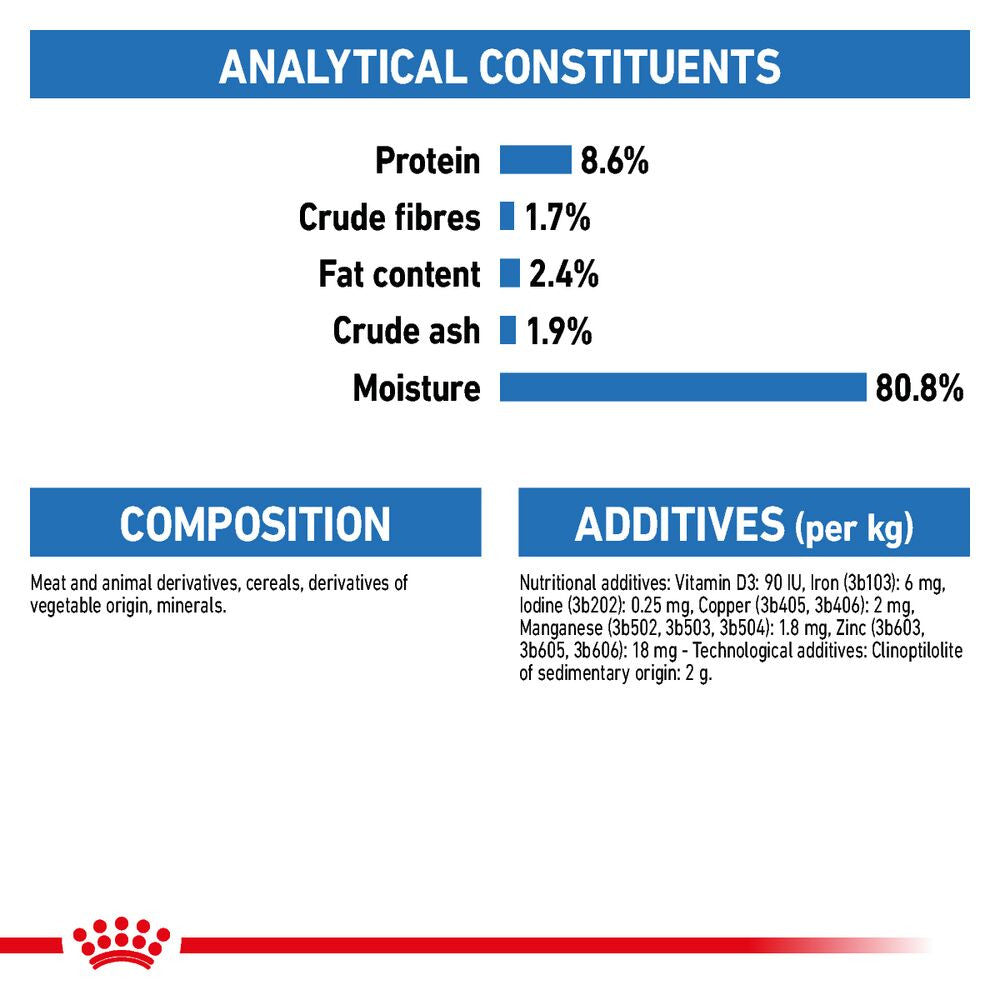 ROYAL CANIN Light Weight Care Loaf is complete and balanced nutrition that is specifically tailored for dogs with a tendency to gain weight. This product is suitable for adult dogs of all shapes and sizes. To help your dog achieve and maintain an ideal body weight, this exclusive formula is rich in EPA and DHA – Omega-3 fatty acids derived from fish oils that have a variety of health benefits for your dog. For one thing, Omega-3 supports joint health by helping to keep your dog’s cartilage healthy. What’s more, this food’s limited dietary fat content helps to keep those extra pounds off your dog, supporting healthy weight management. The inclusion of high-quality, highly-digestible protein helps your dog to maintain a healthy muscle mass. Soluble and insoluble fibres are included to help your dog feel satisfied and full up in-between meals. These nutrients also contribute towards better digestion and maintaining regular gut transit time. This delicious wet pâté loaf comes in multipacks of 85g pouches.