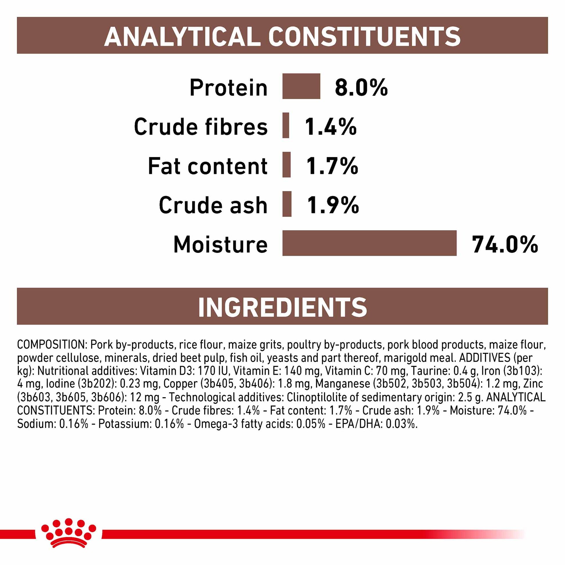 Analytical constituents: Protein: 8.0% - Crude fibres: 1.4% - Fat content: 1.7% - Crude ash: 1.9% - Moisture: 74.0% - Sodium: 0.16% - Potassium 0.16% - Omega-3 fatty acids: 0.05% - EPA/DHA: 0.03%.