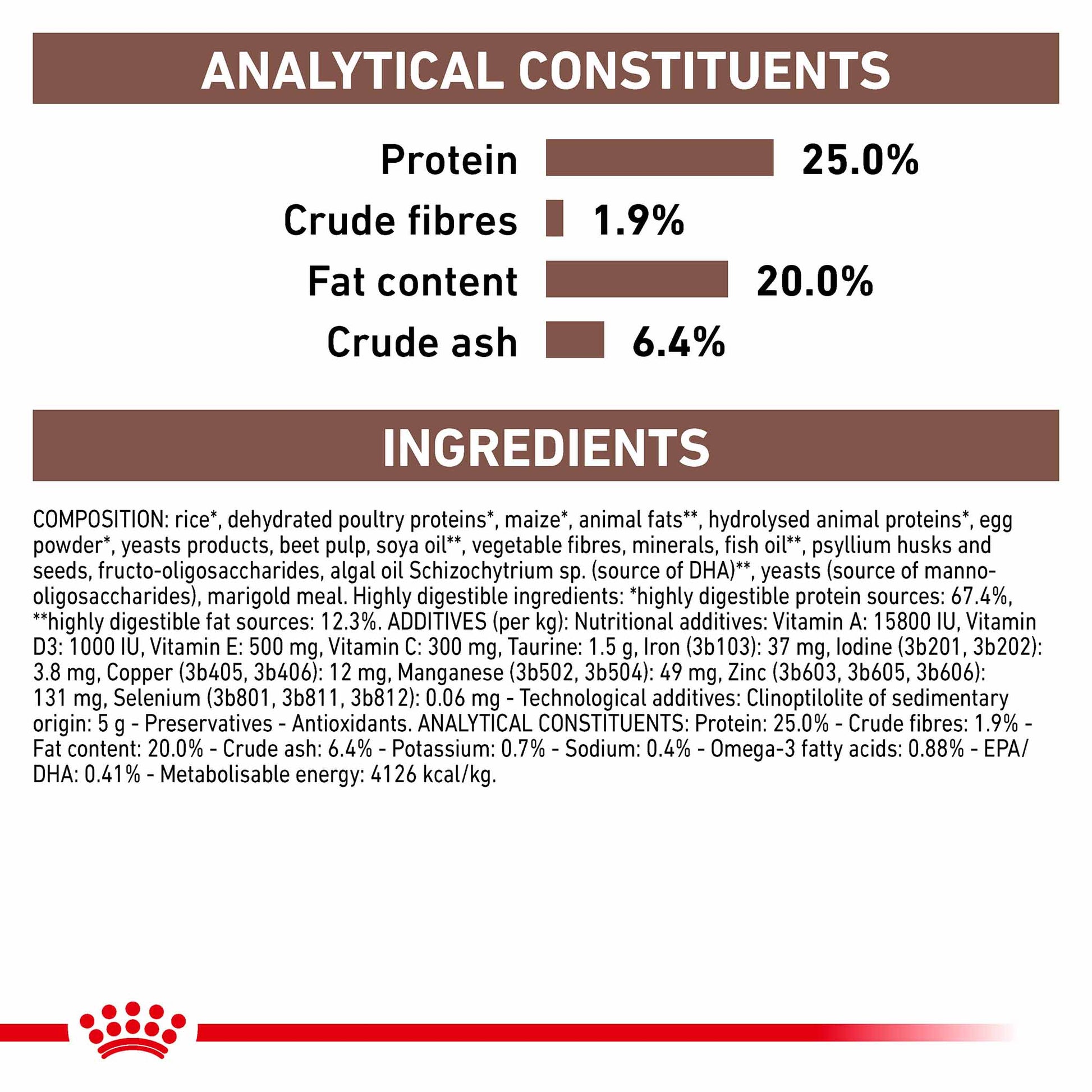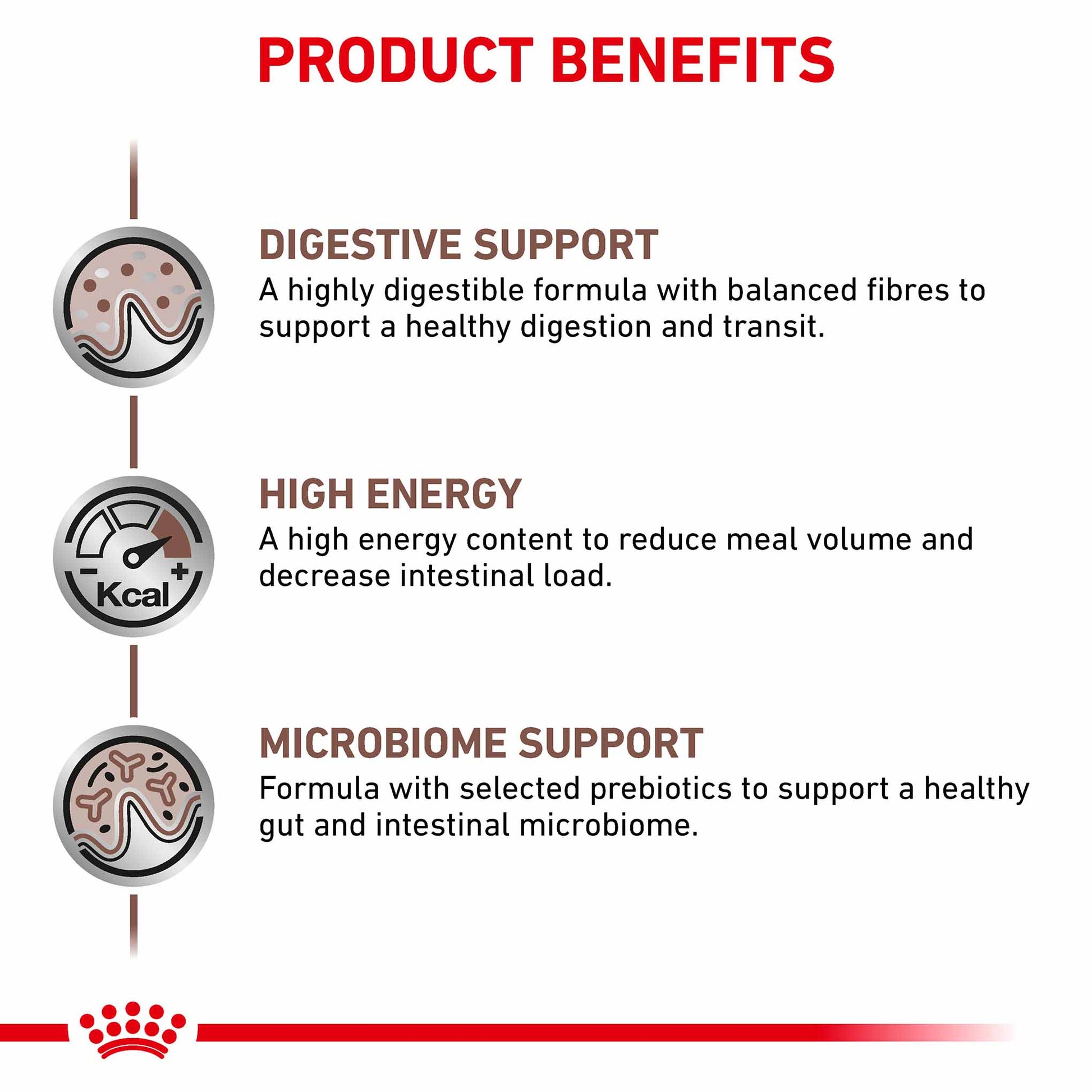 - High Energy - The high energy content in ROYAL CANIN® Gastrointestinal to reduce the volume of your dog’s meal and decrease their intestinal load, which makes digestion much easier for your dog whilst also meeting their general nutritional needs.