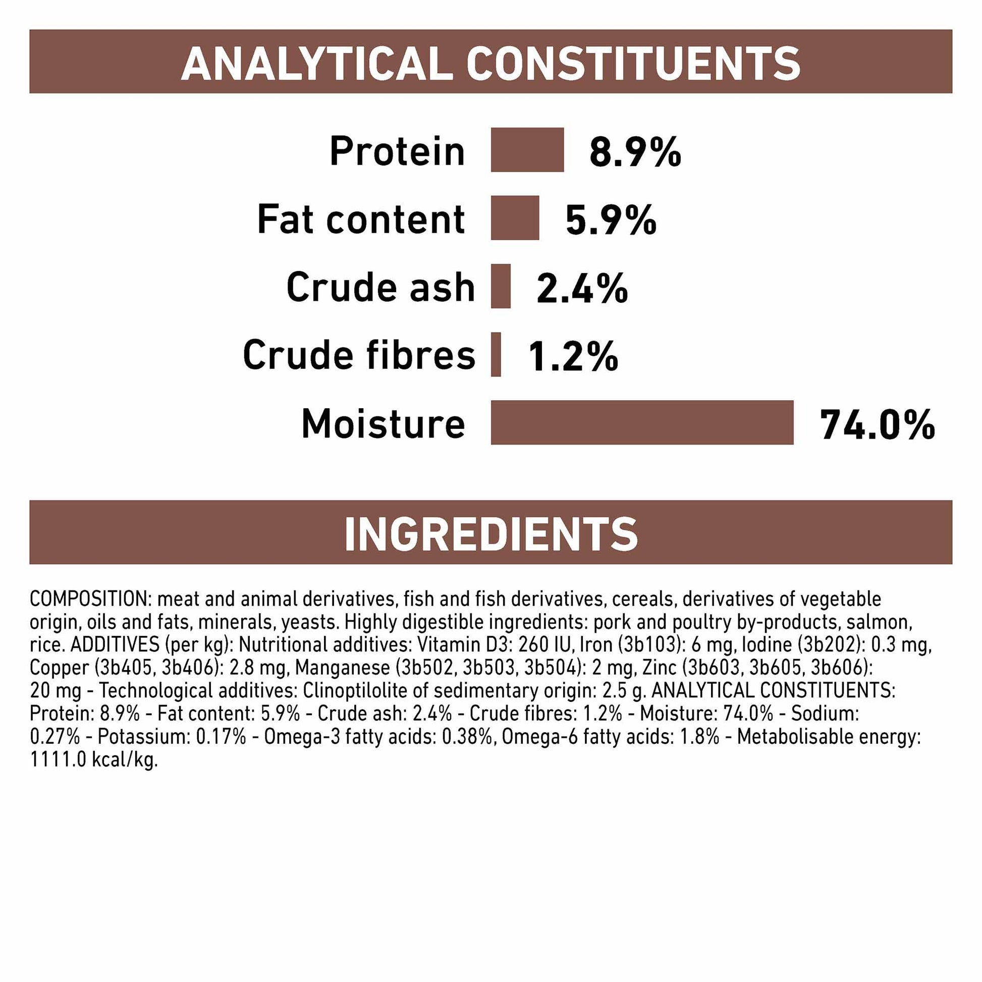 Analytical constituents: Protein: 8.9% - Crude fibre: 1.2% - Fat content: 5.9% - Crude ash: 2.6% - Moisture: 74.2% - Sodium: 0.26% - Potassium: 0.18% - Omega-3 fatty acids: 0.31% - EPA/DHA: 0.14%.