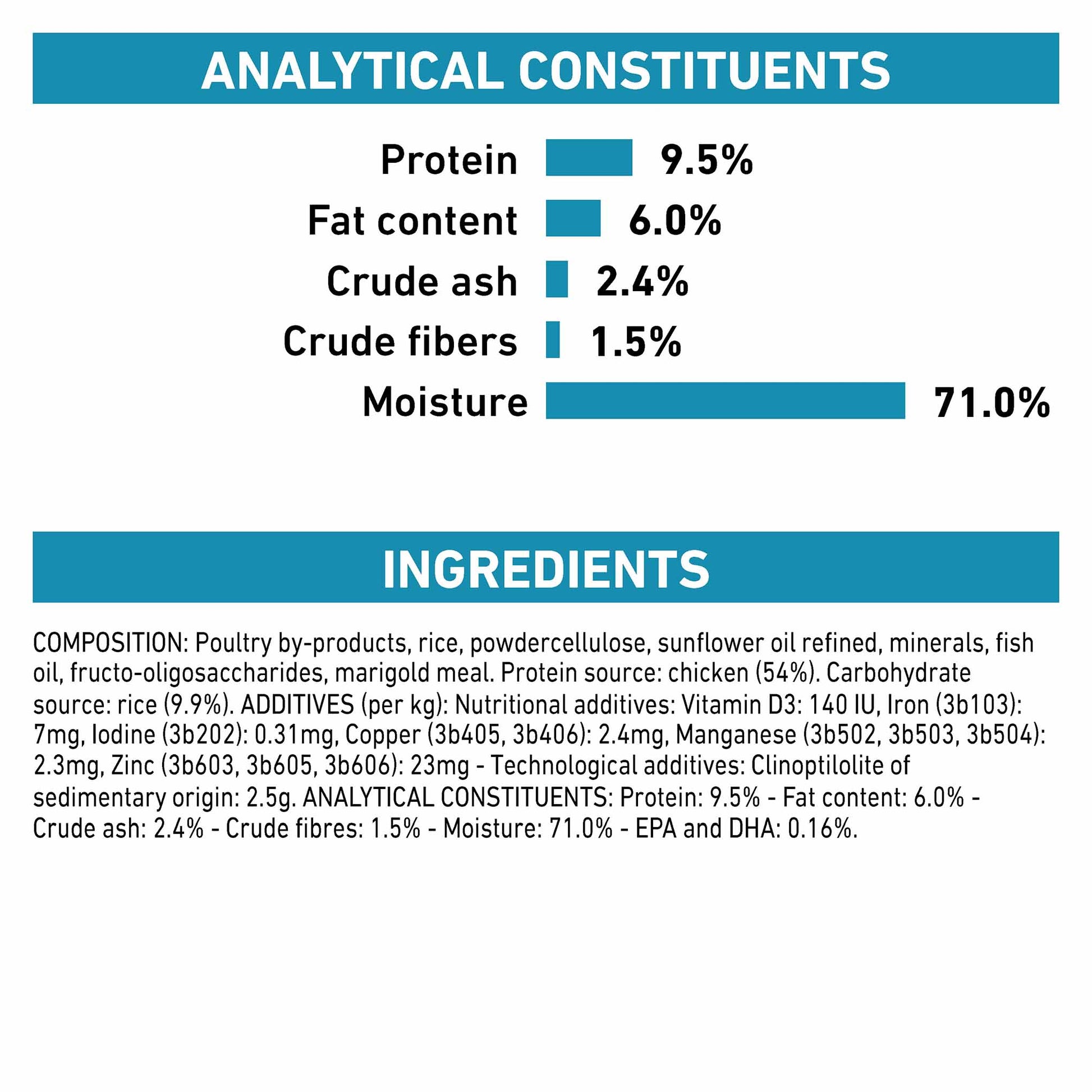 Analytical constituents: Protein: 9.5% - Fat content: 6% - Crude ash: 2.4% - Crude fibres: 1.5% - Moisture: 71% - EPA/DHA: 0.16% - Essential fatty acid (linoleic acid): 1.6%.