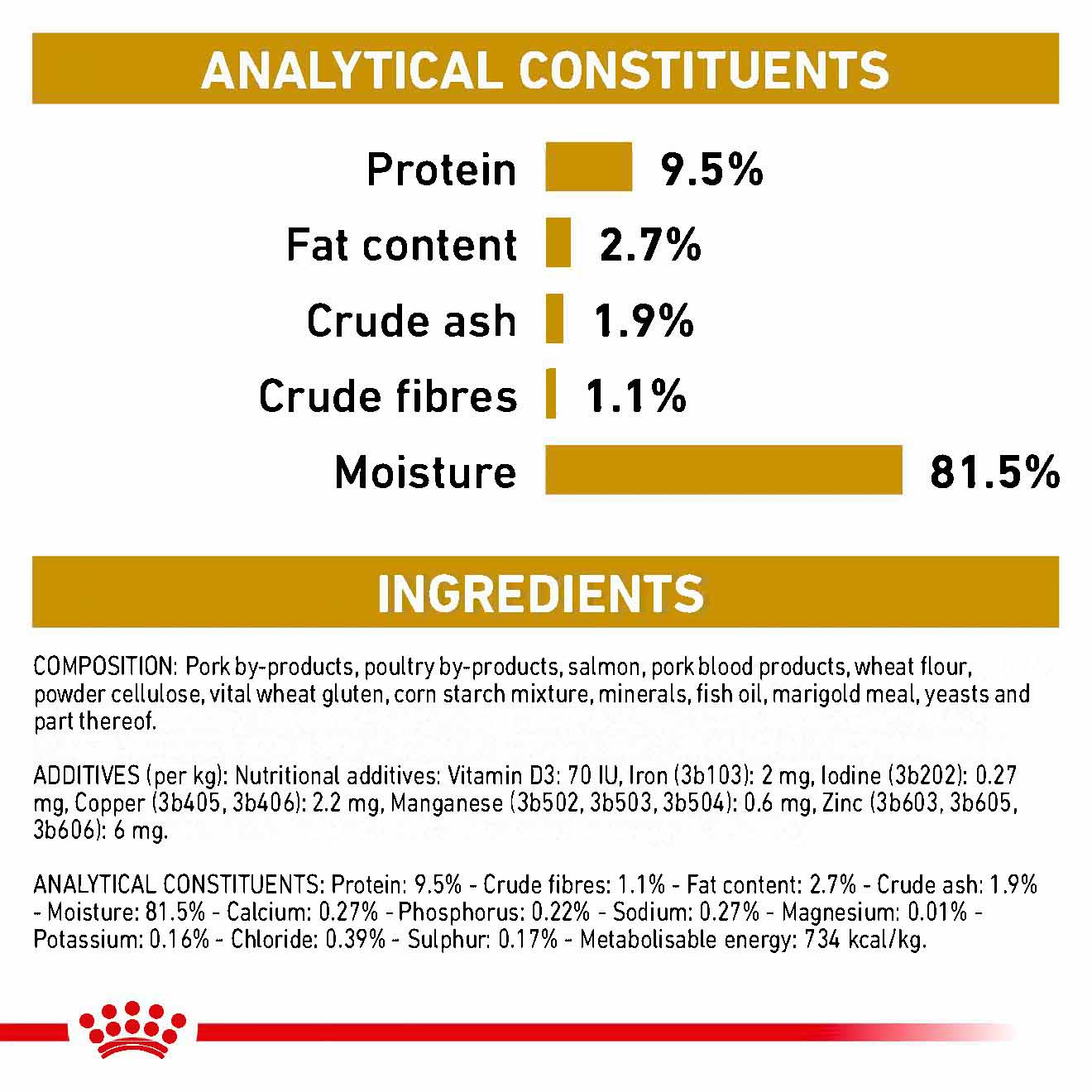 Composition: Poultry by-products, pork by-products, pork blood products, powder cellulose, corn starch mixture, minerals, vital wheat gluten, maize flour, maize gluten, fish oil, yeasts and part thereof, marigold meal.