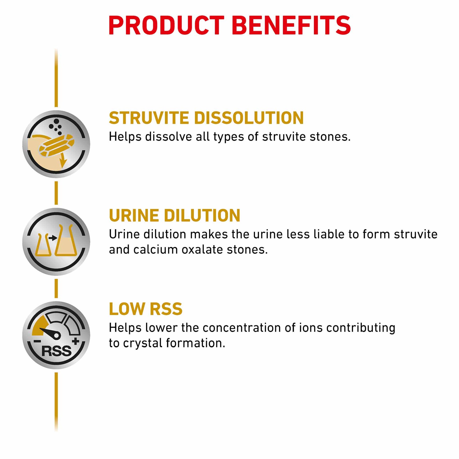 - Low RSS - Relative Super Saturation (RSS) methodology is utilised for the development of ROYAL CANIN® Urinary S/O. RSS helps to lower the concentration of ion in your dog's urine, minimising the likelihood of bladder stones forming.