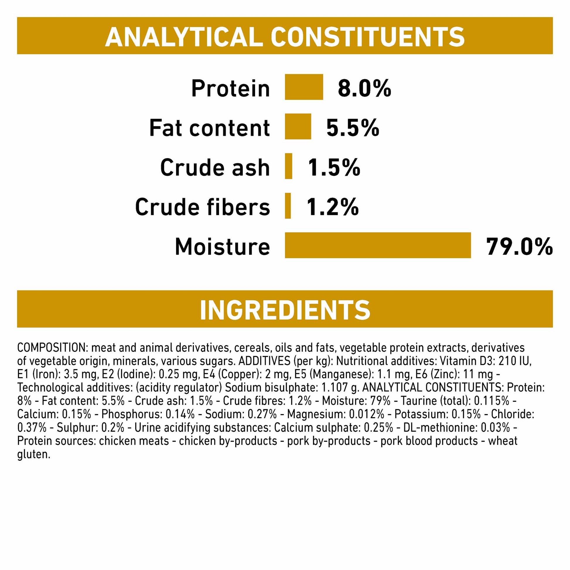 Composition: Pork by-products, poultry by-products, wheat flour, sunflower oil refined, corn starch mixture, vital wheat gluten, powder cellulose, pork blood products, minerals, fish oil, marigold meal, yeasts and part thereof.