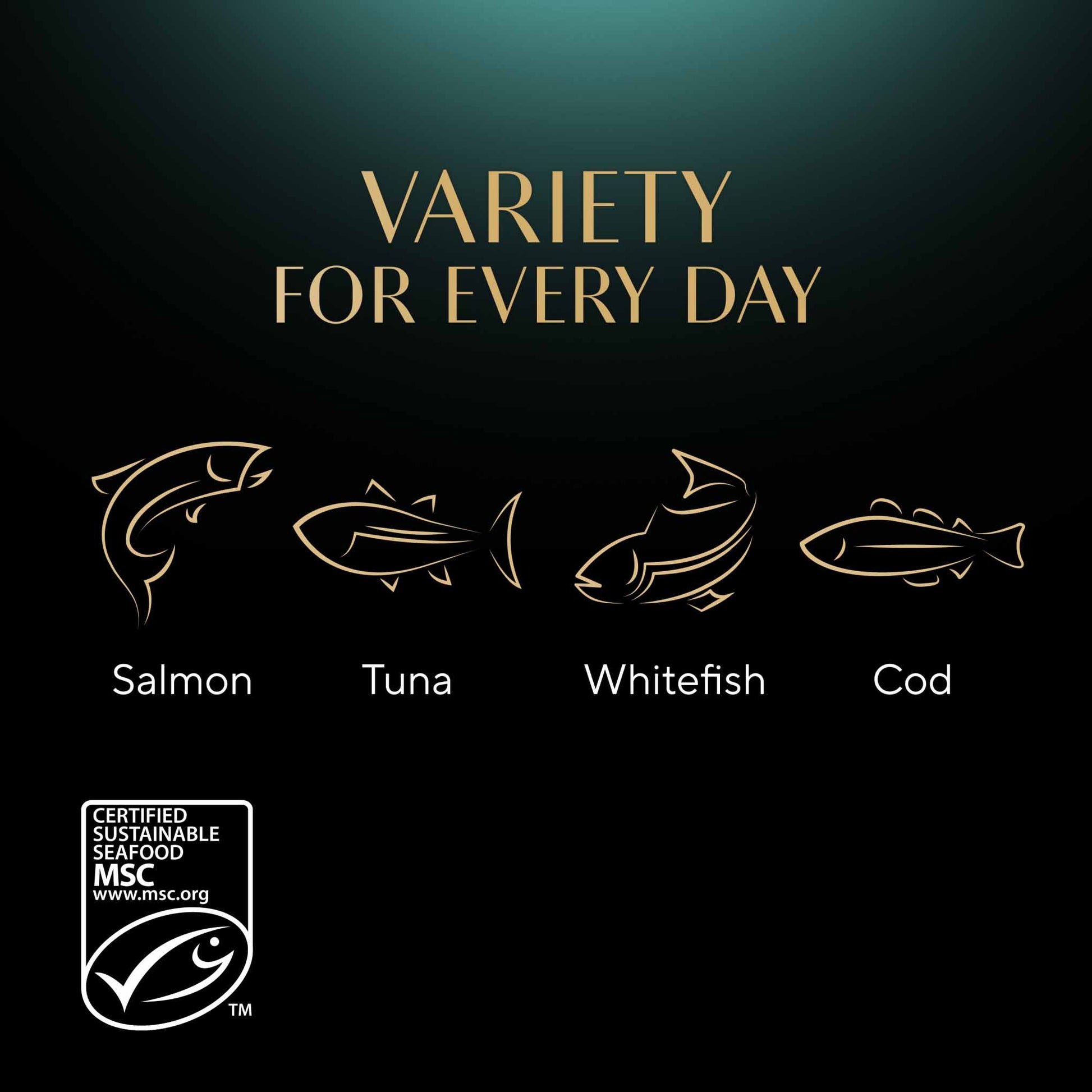 - Adult cat food with a delicious variety of cod, salmon, tuna and whitefish in jelly.