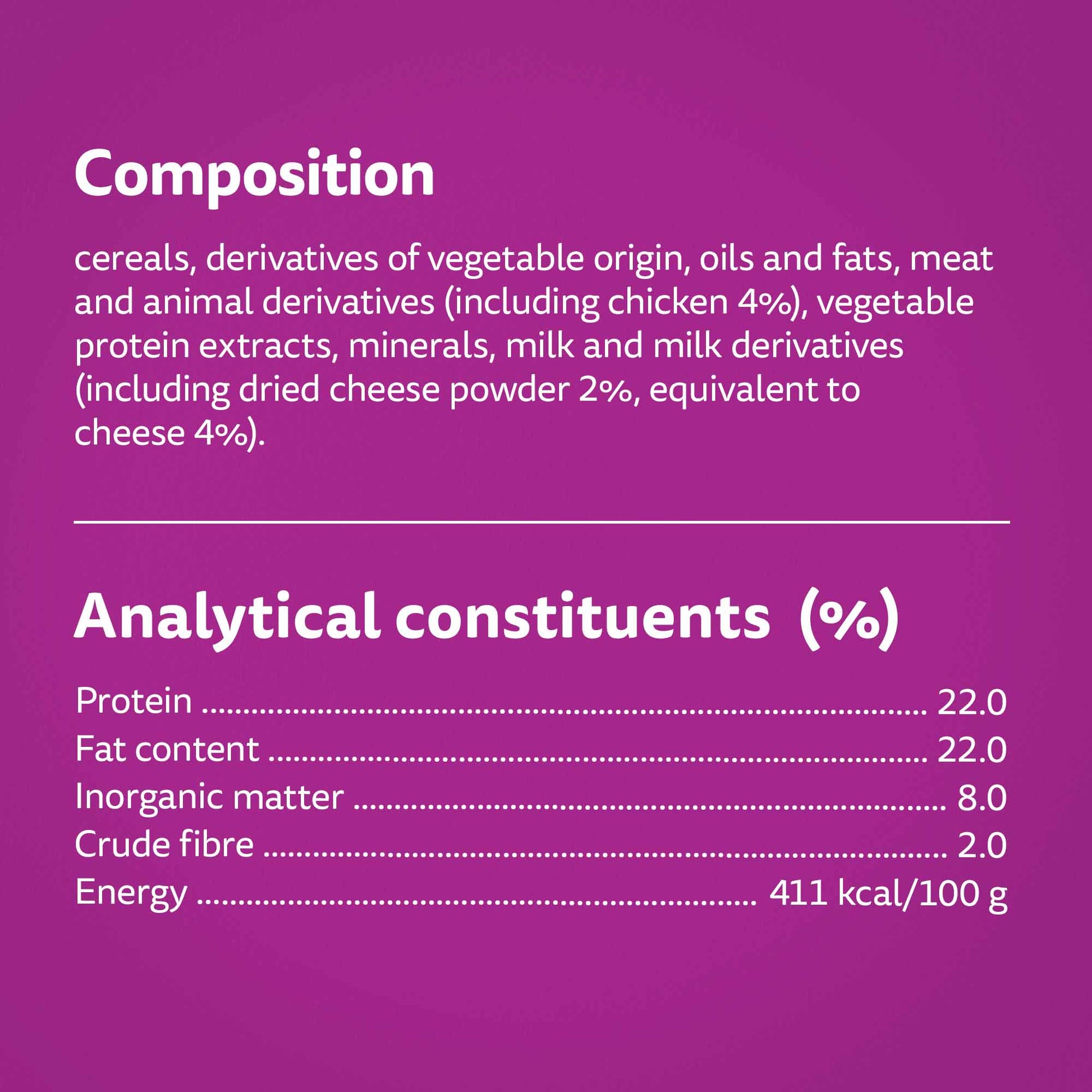 Composition: cereals, derivatives of vegetable origin, oils and fats, meat and animal derivatives (including chicken 4%), vegetable protein extracts, minerals, milk and milk derivatives (including dried cheese powder 2%, equivalent to cheese 4%).