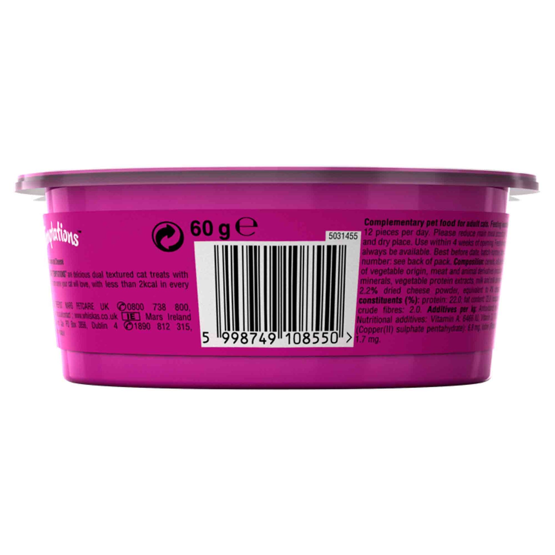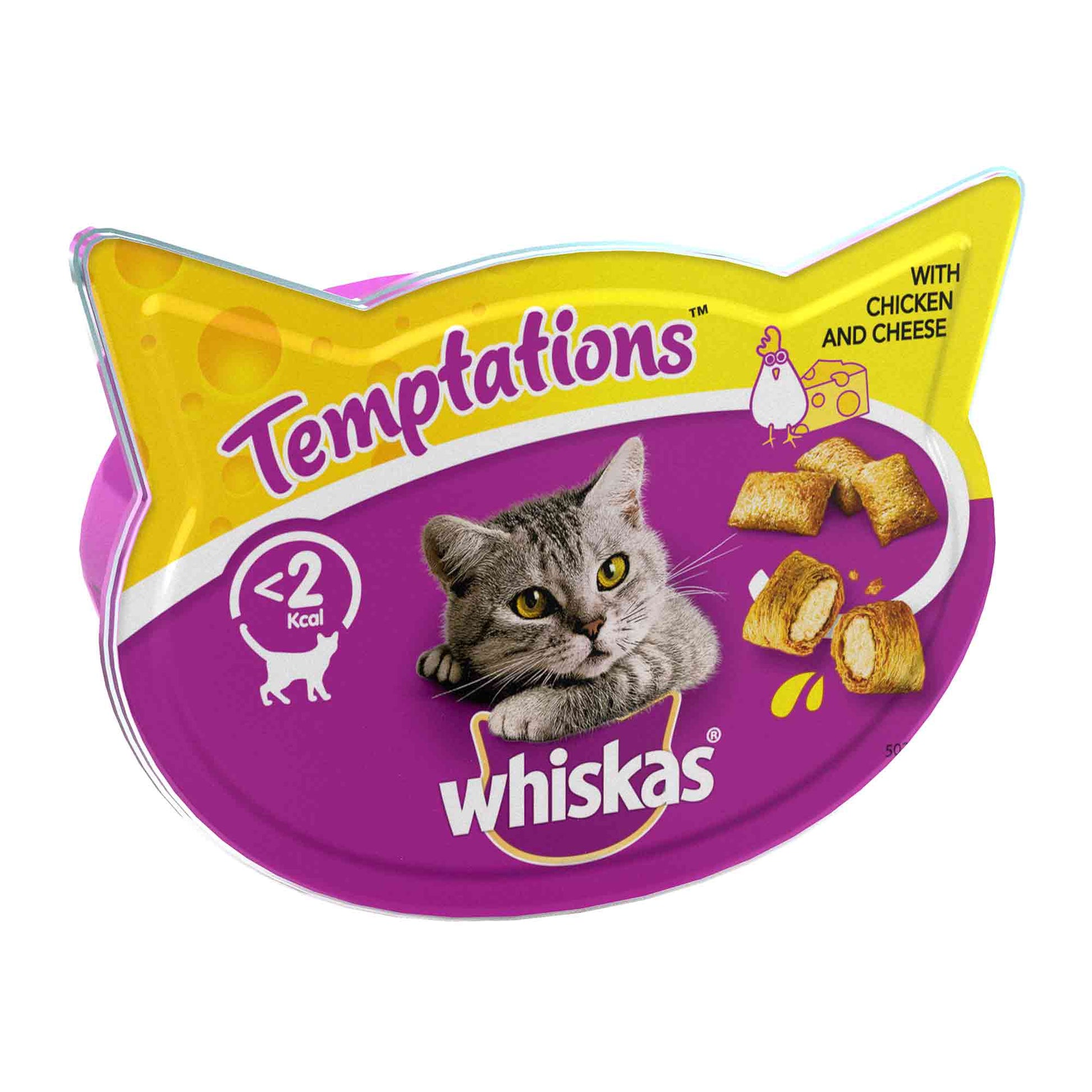 Whiskas Temptations are delicious adult cat treats with a tasty crunchy outside and an irresistible soft centre.