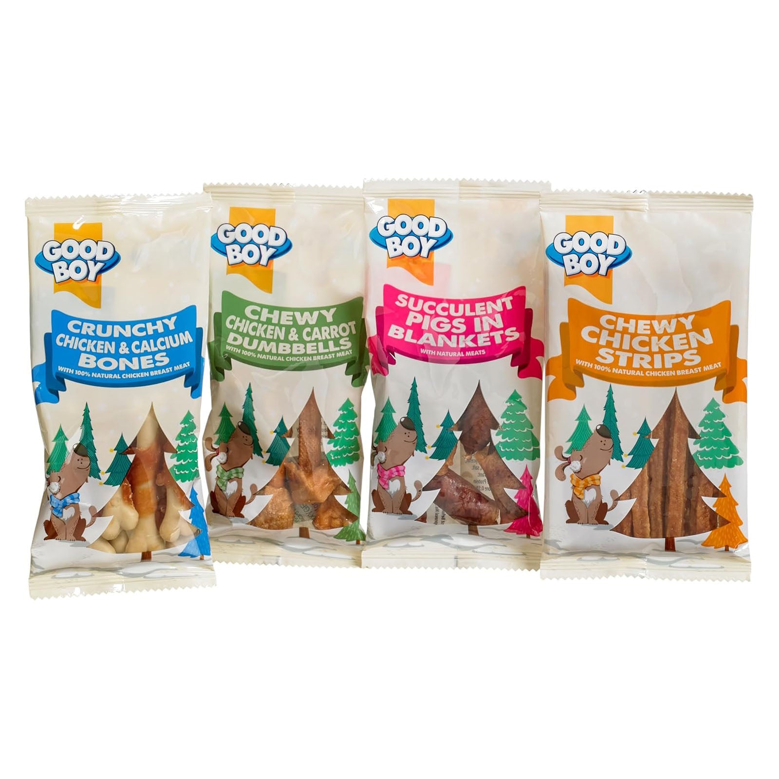 Good Boy Real Meat Gift Tin is a stylish gifting tin is packed with yummy high meat Chicken Strips, Pigs in Blankets, Chicken and Carrot Dumbbells and Chicken and Calcium Bones. Also includes a tug rope dog toy.