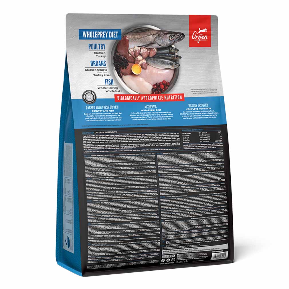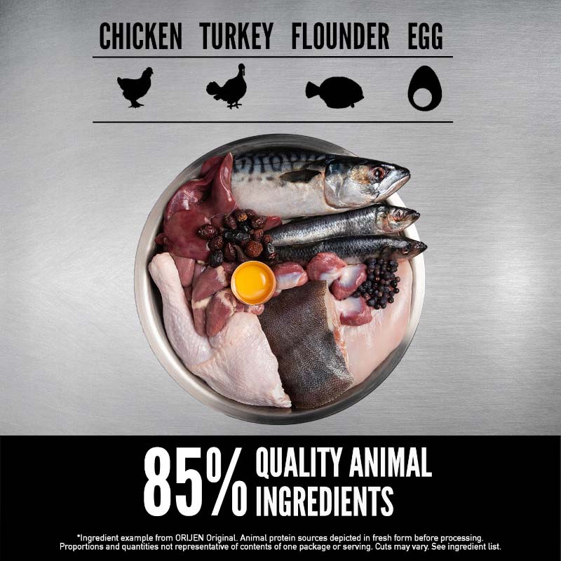 *Approximate and derived from the unprocessed state of the ingredients. **Our free-run chickens and turkeys are not housed in cages and are able to move in a barn without outdoor access. ***Orijen's fresh ingredients use refrigeration as the sole method of preservation and our raw ingredients are frozen at their peak freshness.