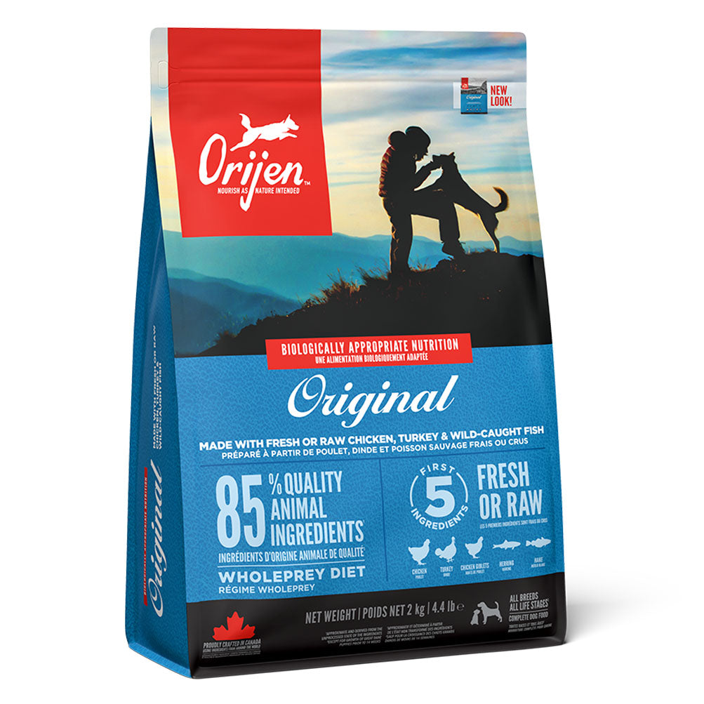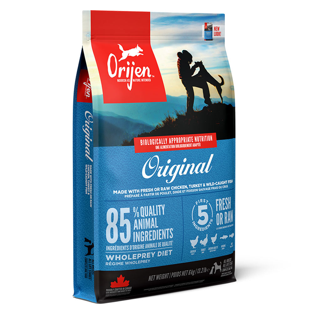 Help your dog thrive with the power of protein-rich recipes that provide peak nourishment. Dogs are ancestral carnivores, so they need a Biologically Appropriate diet rich and varied in whole animal ingredients. ORIJEN Original dog food diet is packed with 85%* quality animal ingredients like fresh or raw free-run** chicken and turkey, and wild-caught or sustainably farmed fish. Packed with WholePrey animal ingredients like organs and bone, ORIJEN dog food is made with the most nutrient-dense, succulent parts of the prey to deliver the nutrition dogs need. The result is a diet for your canine companion that is beyond comparison.