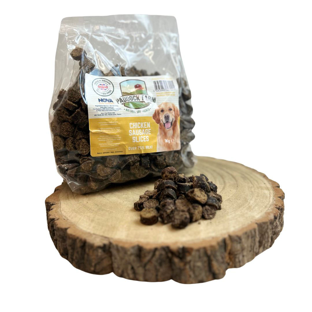 Paddock Farm Chicken Sausage Slices are a high-protein, natural treat made with 80% chicken and sweet potato — perfect for dogs who love a meaty snack. Packed with flavour and free from grains and artificial additives, they’re a great everyday reward for dogs of all breeds and sizes. Suitable from 8 weeks old.