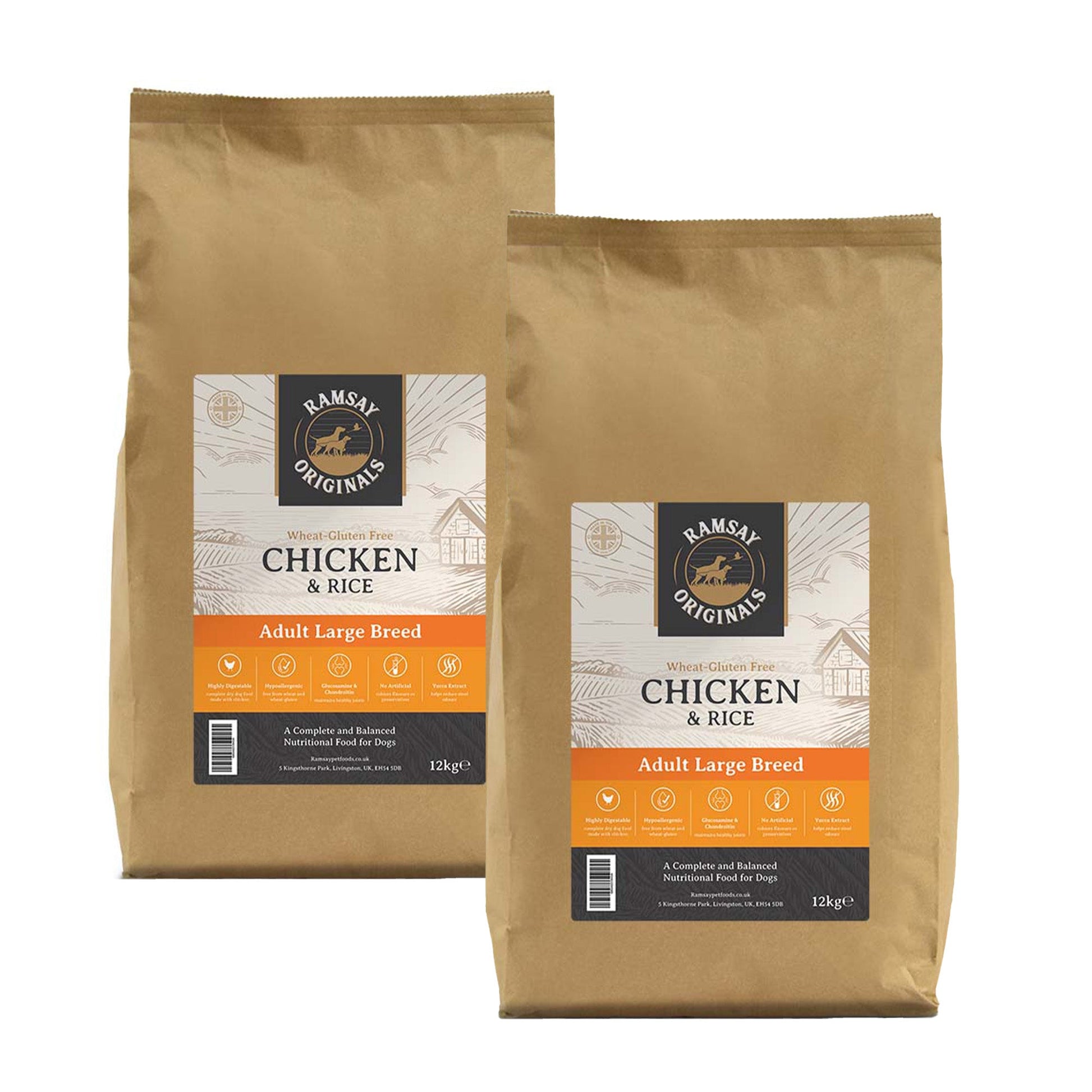 Our Ramsay Originals Large Breed Adult Chicken & Rice recipe is highly palatable using a single protein source, as well as rice, glucosamine, chondroitin and yucca extract to create a hypoallergenic dry food that is free from gluten to help digestion, joints and improve skin and coat issues. It is free from wheat and wheat-gluten, with no added artificial colours, flavours or preservatives. With only the highest quality ingredients used, our Ramsay Originals Gluten Free range is a complete and balanced recipe that provides all the nourishment that your dog needs to enjoy optimal health and vitality.